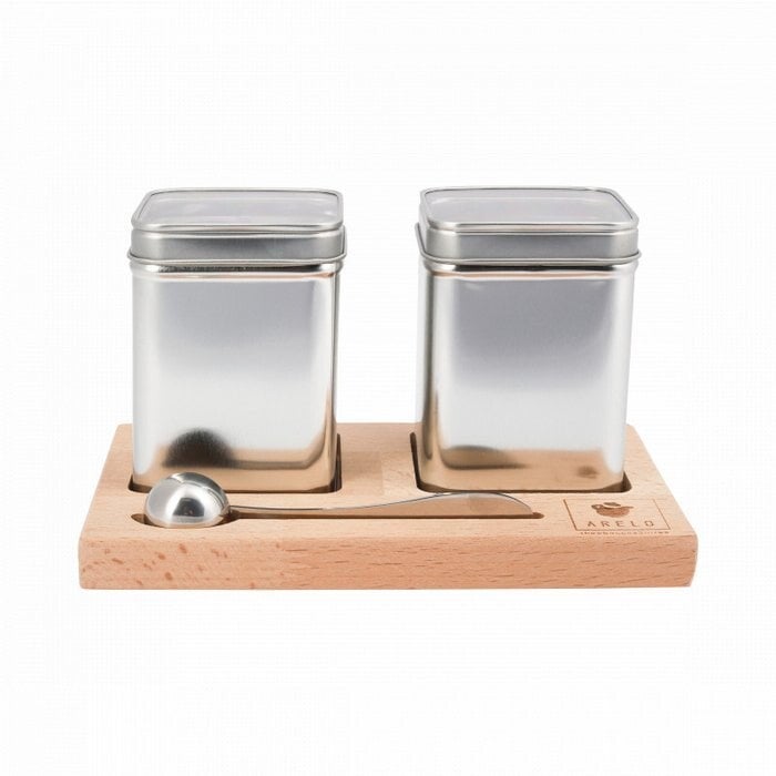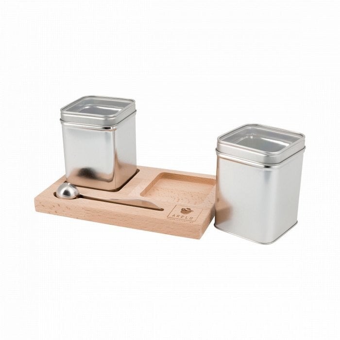 1x Theeplank met 2 vensterblikjes en rvs maatlepel van ARELO thee & accessoires.