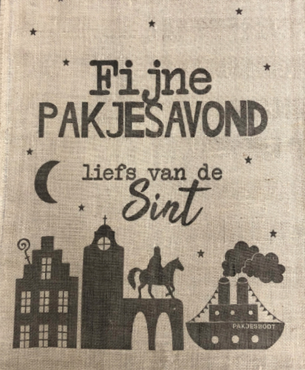 Deze mooi bedrukte jute zak kaartje met "Fijne pakjesavond liefs van de Sint" is perfect om alle cadeaus voor pakjesavond in te doen. Ook leuk als decoratie in een etalage.